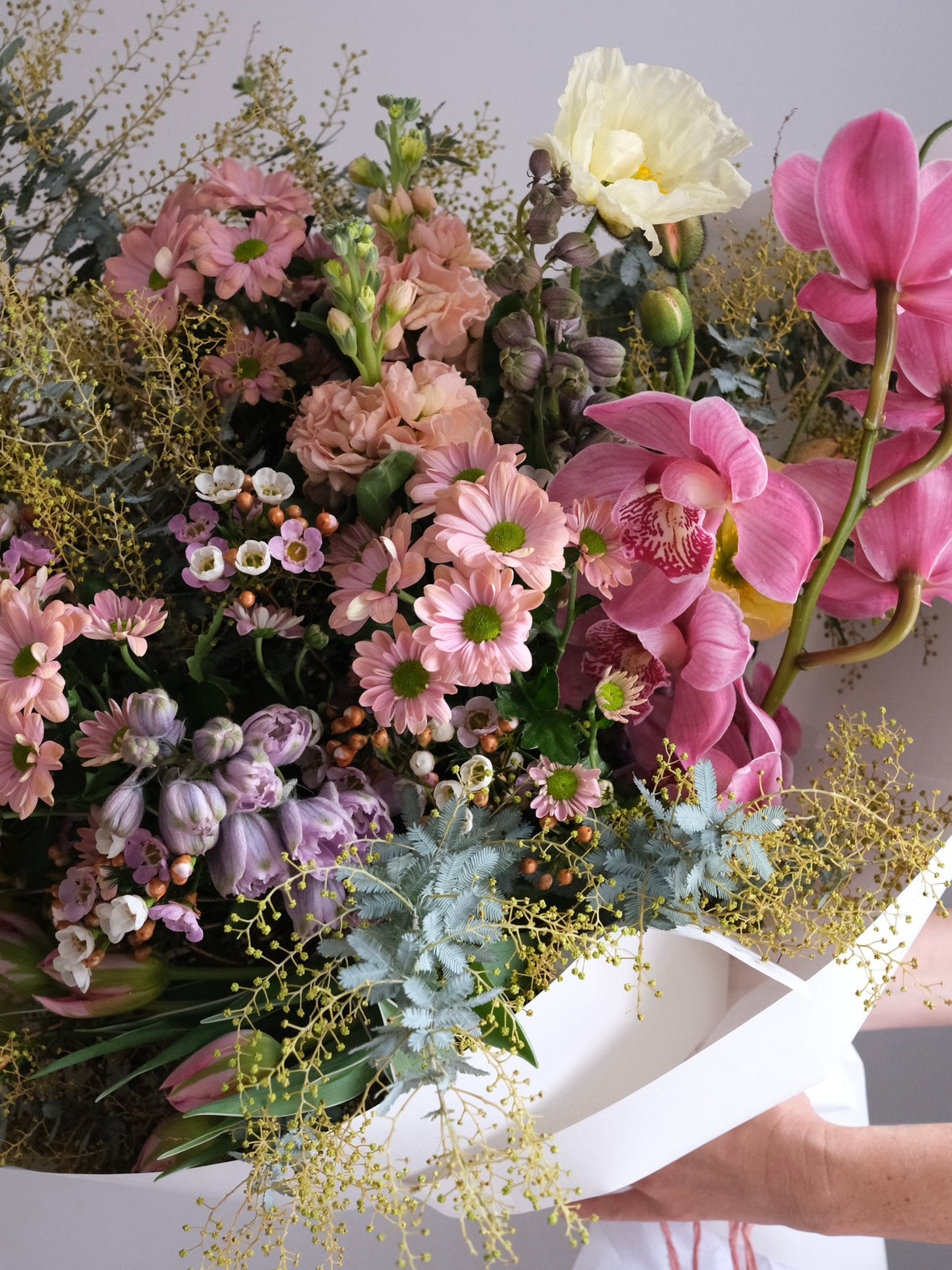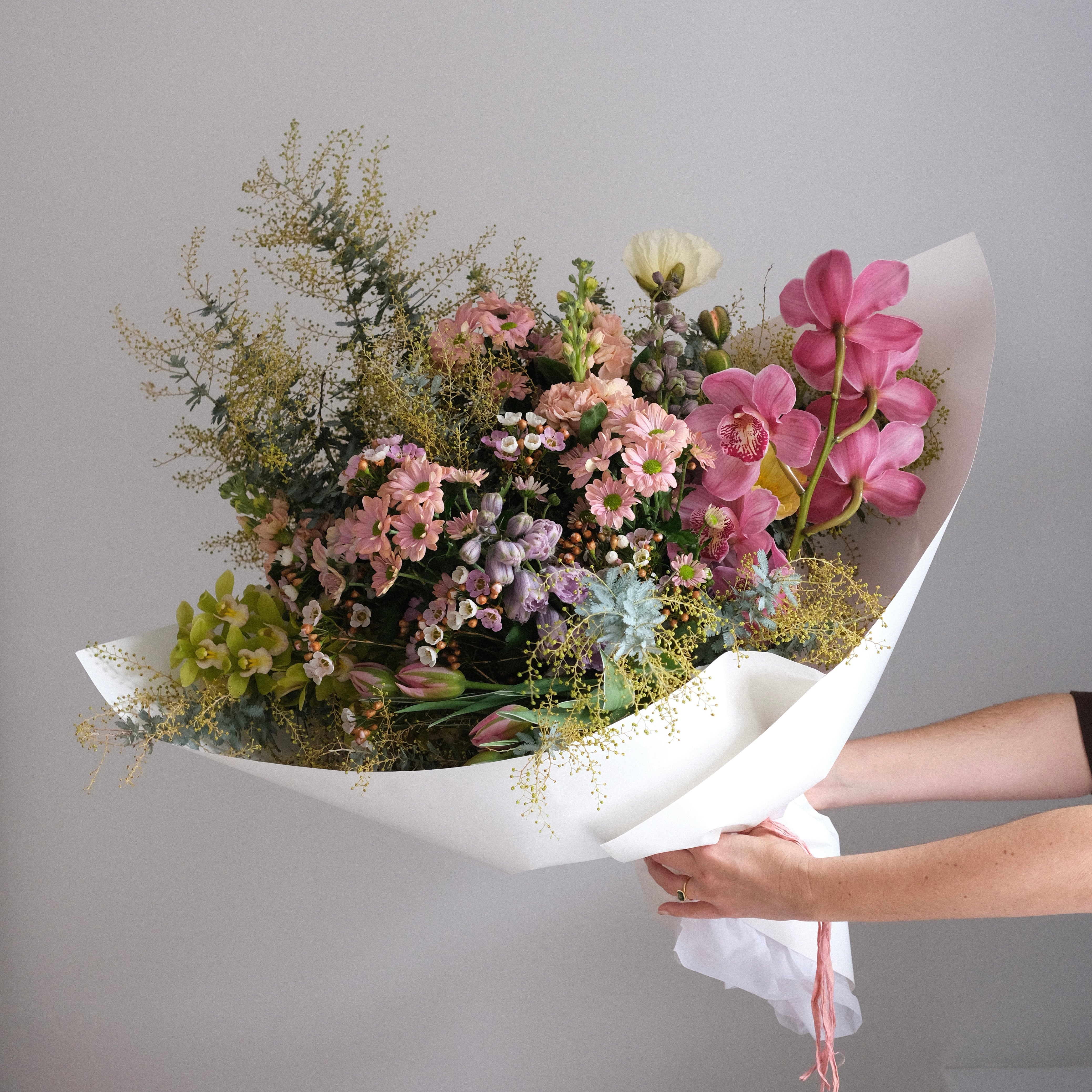 Our head florist sources flowers from selected Australian growers for their freshness and variety, which are then conditioned and arranged to order, and finished in our signature gift wrap of Forest Stewardship Certified paper, plant-based wet packs to ensure the flowers remain hydrated until gifted, and silk ribbon - no floral-foam, no imports, no chemically dyed flowers!